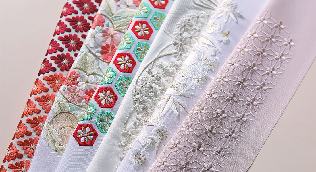襟元を美しく見せる半襟。シンプルな物から豪華な物まで、各種ご用意いたします。